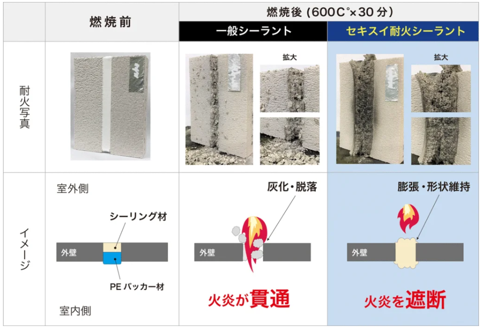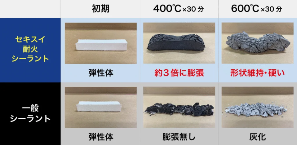 耐火シーラントは、火災時に高温によりシーリング材が膨張、焼成することで目地部分 からの火炎の貫通や裏面温度の上昇を抑えます。 通常の硬化物は柔軟なゴム弾性をもち、目地への追従・止水効果 を発揮します。